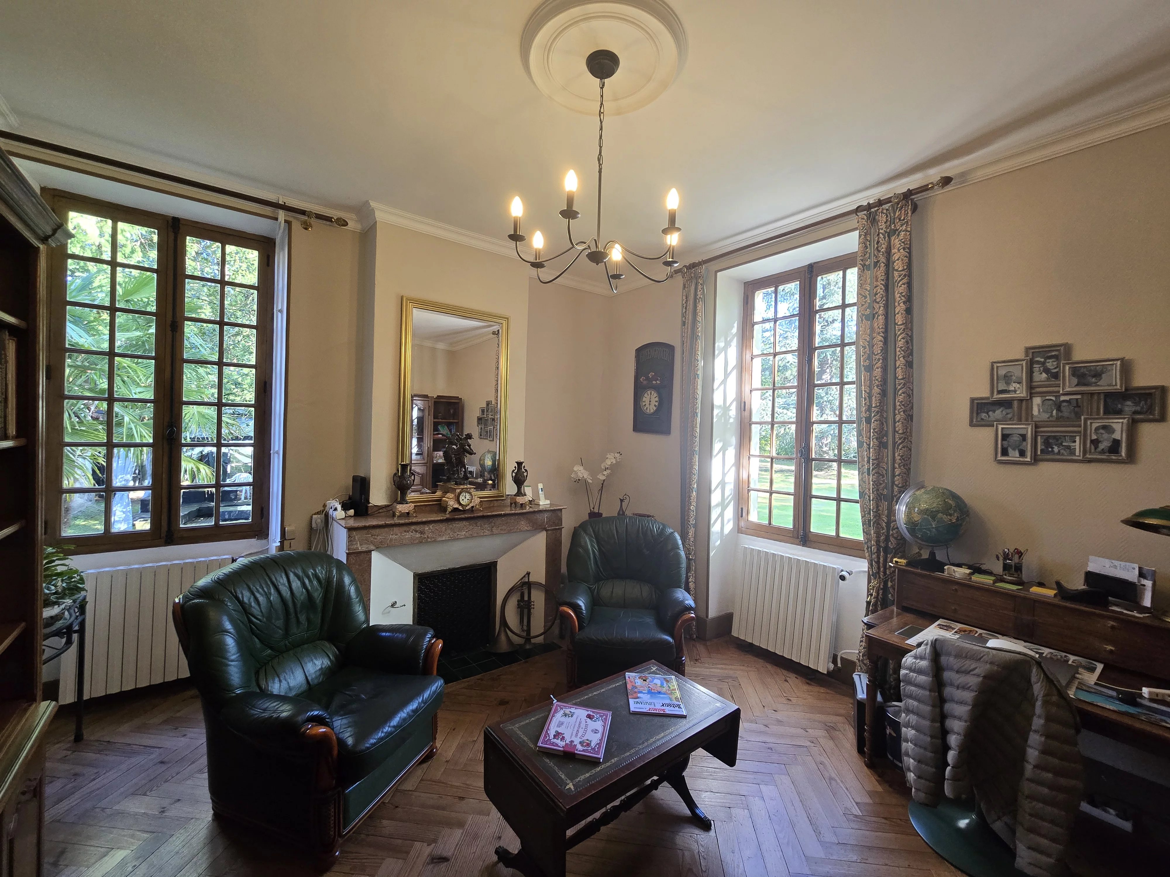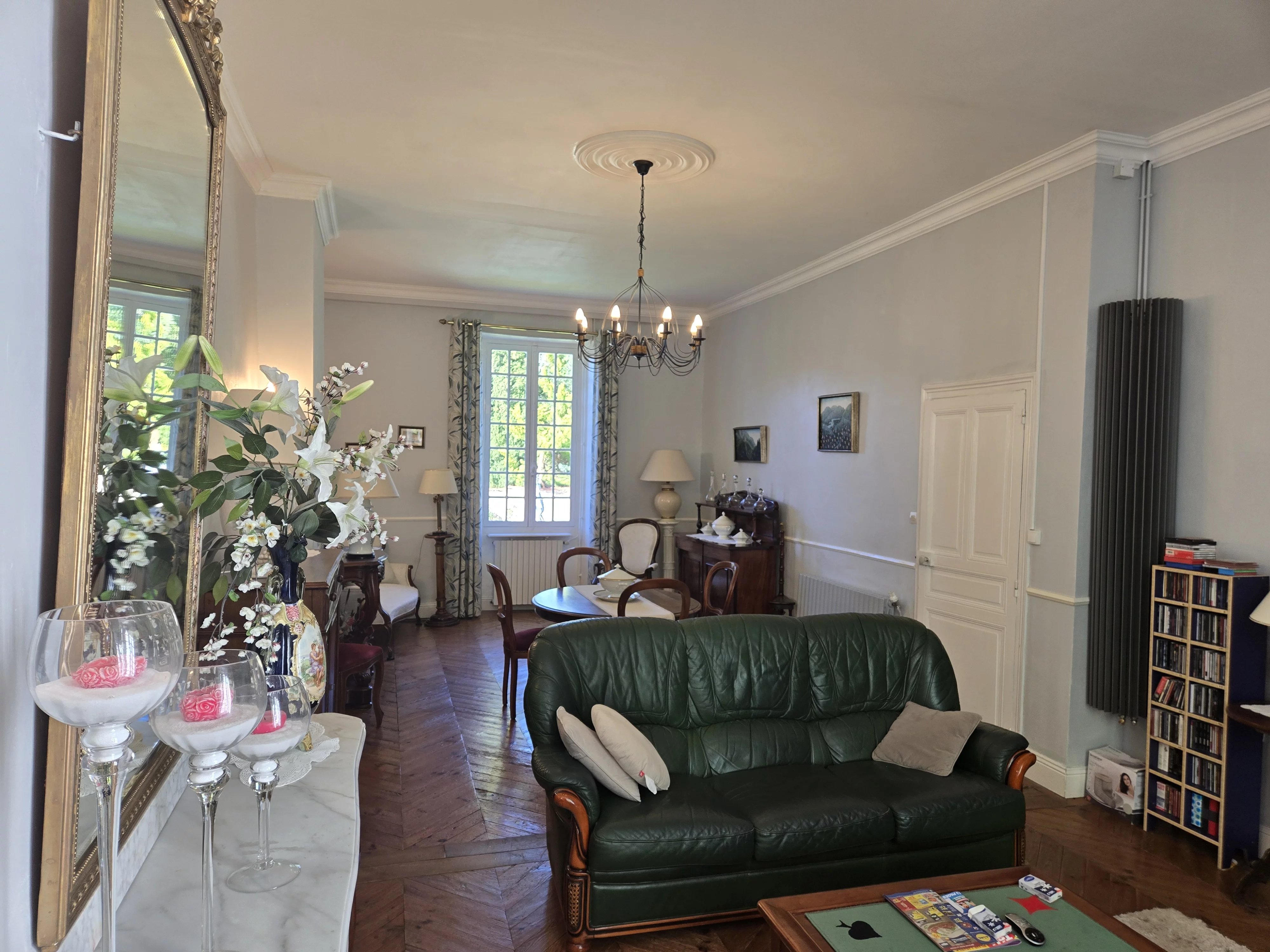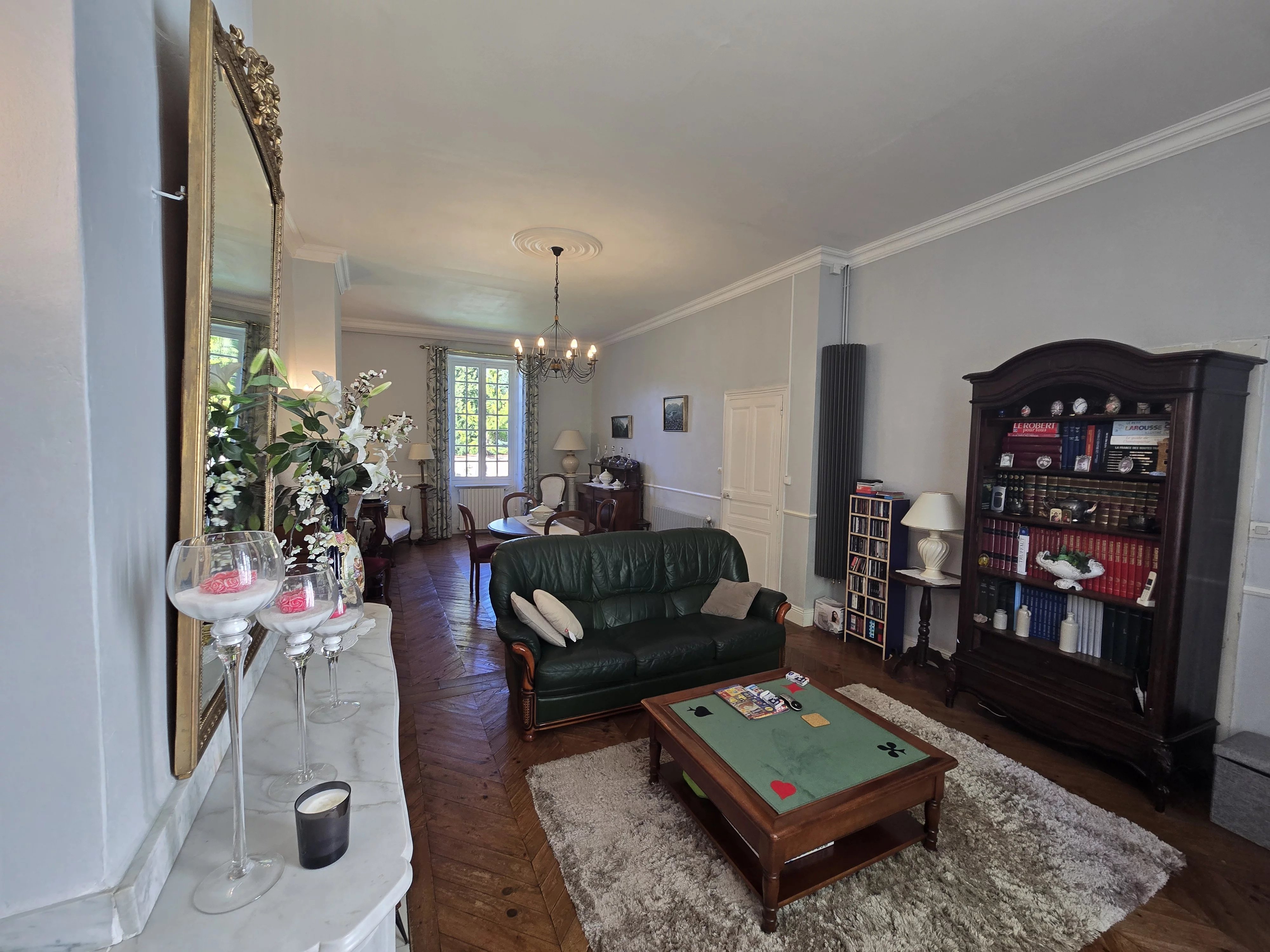 Dès l’entrée, le charme opère avec ses carreaux de ciment d’époque à motifs, une belle pièce de vie lumineuse avec cheminée et parquet en point de Hongrie.