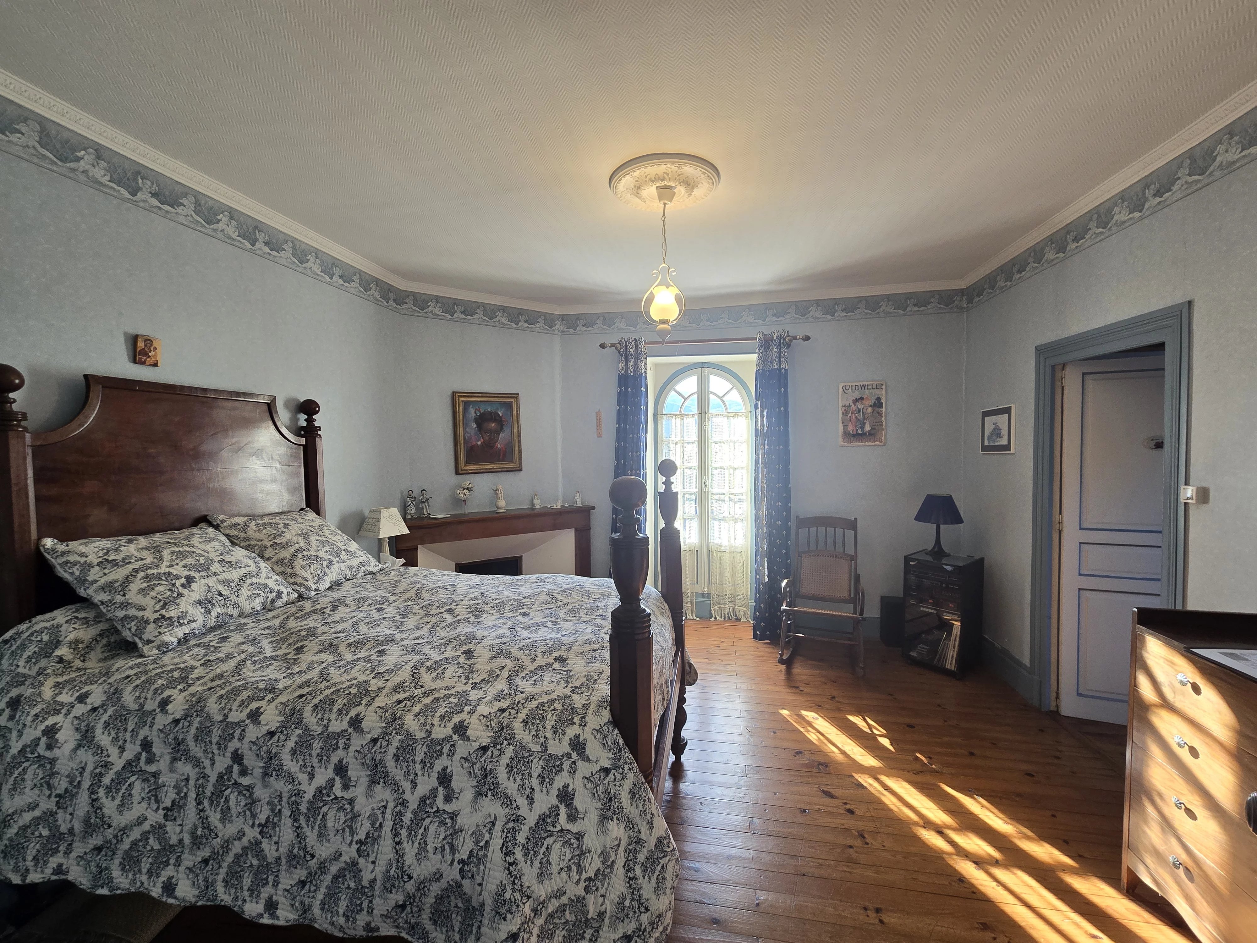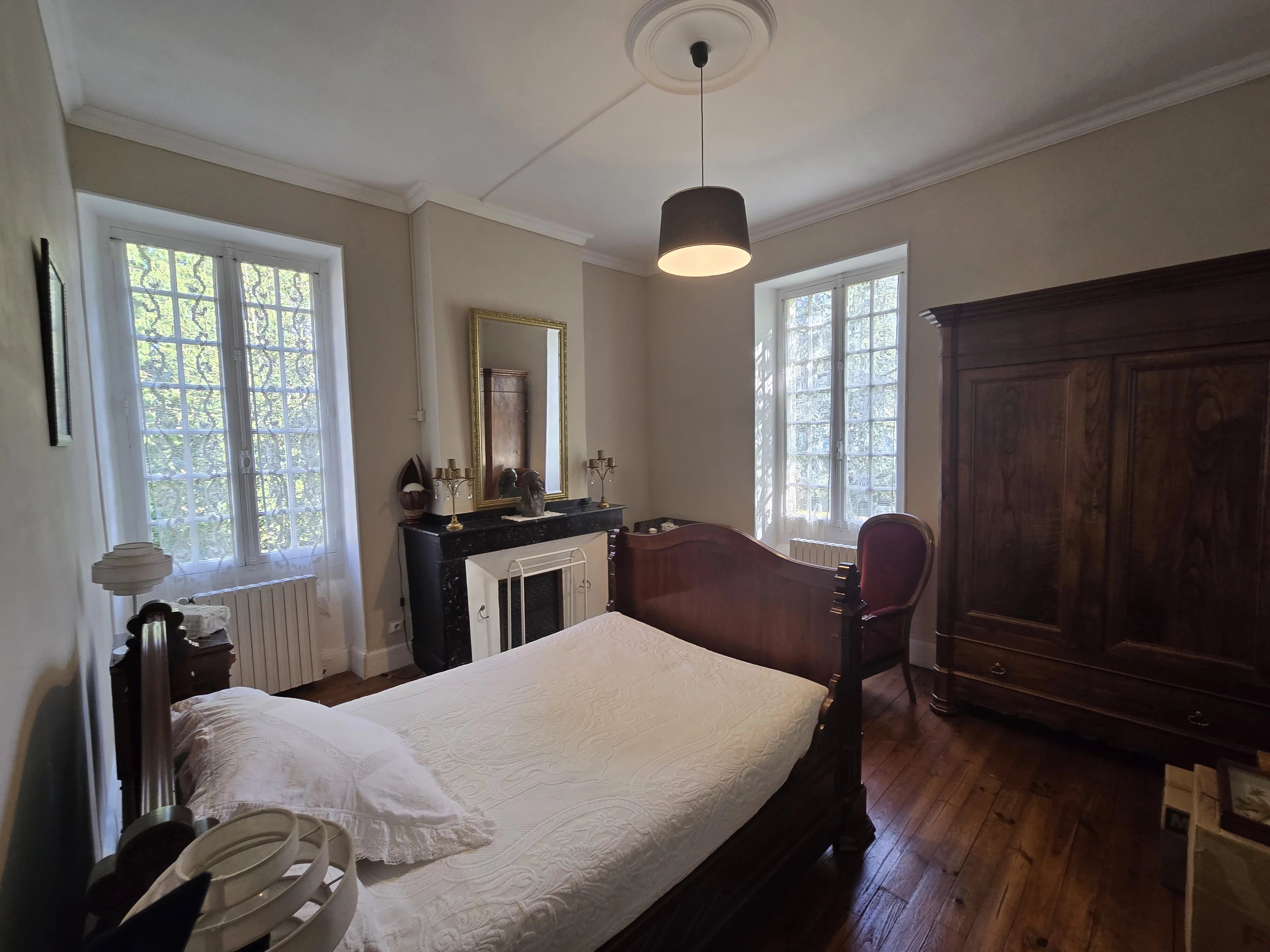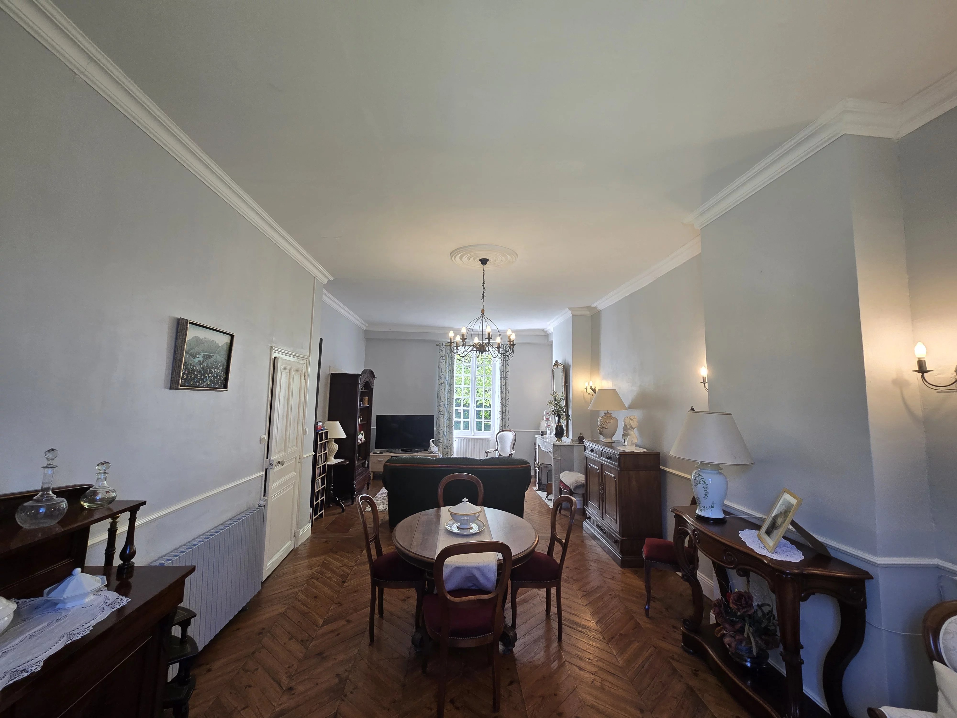 Dès l’entrée, le charme opère avec ses carreaux de ciment d’époque à motifs, une belle pièce de vie lumineuse avec cheminée et parquet en point de Hongrie.